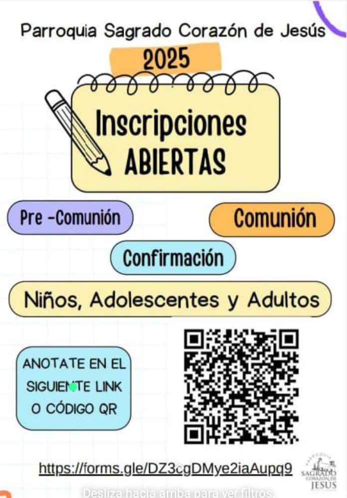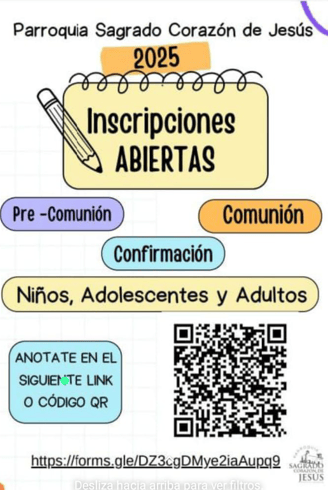📰 Inscripción 2025 - SCDJ: La Parroquia Sagrado Corazón de Jesús abre inscripciones para catequesis [Ciudad], [Fecha] – La Parroquia Sagrado Corazón de Jesús informa que ya se encuentran abiertas las inscripciones para la Catequesis 2025. Bajo el lema "Inscripciones Abiertas", se convoca a niños, adolescentes y adultos a iniciar el camino de preparación sacramental para el próximo ciclo. Las inscripciones incluyen las siguientes etapas: Bautismo (Adultos) Pre-Comunión Comunión Confirmación 📅 Inicio de la catequesis: semana del jueves 20, viernes 21 y sábado 22 de marzo de 2025. 📌 Cierre de inscripción: 5 de abril de 2025. ⚠️ La inscripción se acreditará únicamente presentando la totalidad de la documentación requerida. 📲 Consultas puntuales: Para dudas específicas sobre Comunión para niños de 7 años / adolescentes y Confirmación de adultos, comunicarse exclusivamente por WhatsApp al 2805050097. 📝 Formulario de inscripción online El proceso se realiza de forma digital a través del siguiente enlace: 👉 https://forms.gle/DZ3cgDMye2iaAupq9 También puede acceder escaneando el código QR disponible en los medios oficiales de la parroquia.
