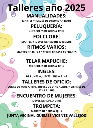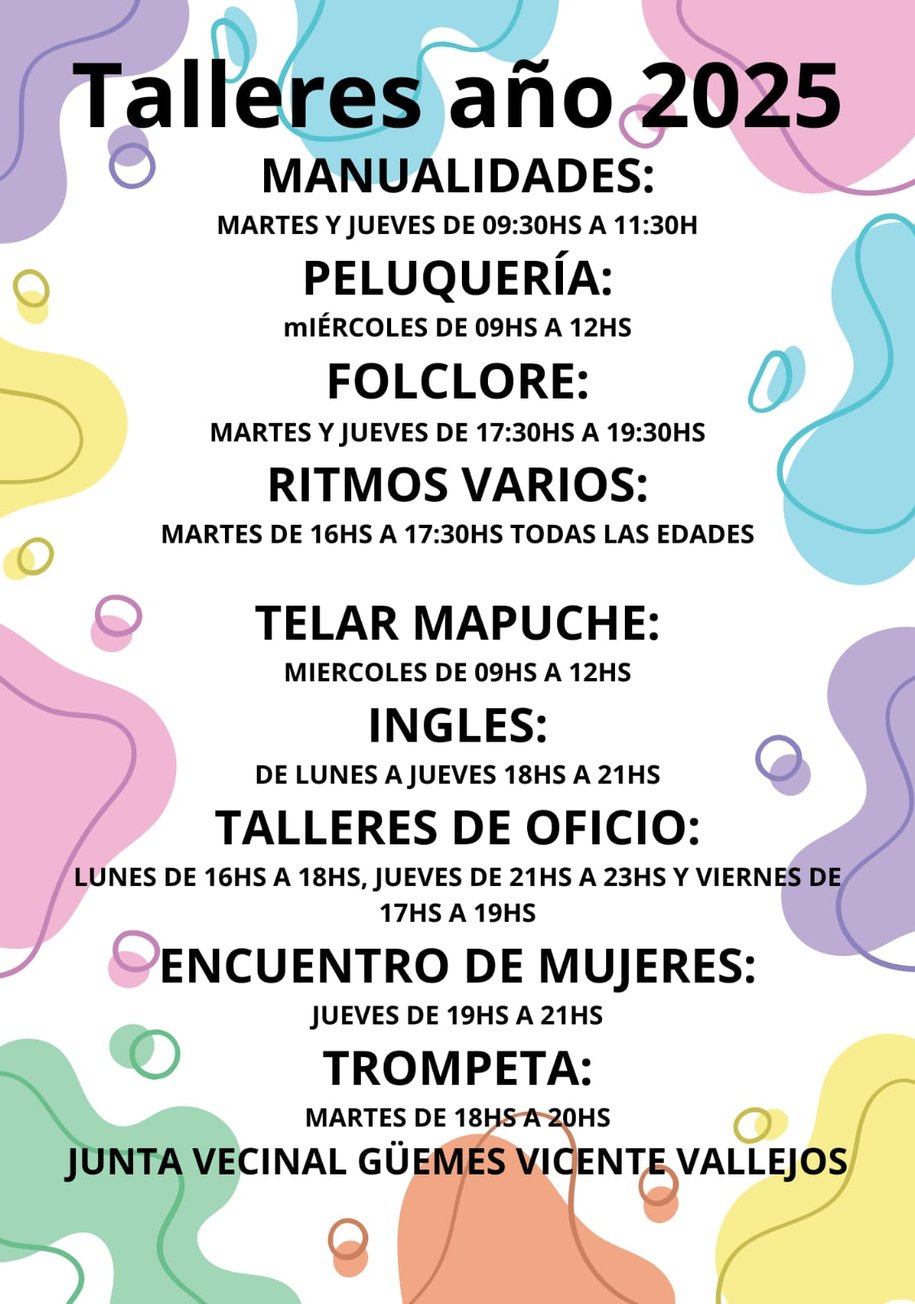 📰 La Junta Vecinal Güemes lanza su agenda de talleres 2025 con múltiples propuestas para la comunidad Puerto Madryn, marzo 2025 – Con una amplia y variada propuesta formativa, la Junta Vecinal Güemes "Vicente Vallejos" anunció el inicio de sus talleres 2025, destinados a vecinos y vecinas de todas las edades que deseen aprender, expresarse o perfeccionarse en diversas disciplinas. Las actividades incluyen tanto oficios como expresiones culturales, actividades recreativas y espacios de encuentro