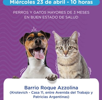 La Municipalidad de Puerto Madryn continúa con su compromiso por el bienestar animal y la salud pública, y este miércoles 23 de abril a las 10 horas llevará a cabo una nueva campaña de aplicación antirrábica y desparasitaria. La actividad se realizará en el Barrio Roque Azzolina, específicamente en Krotevich - Casa 11, entre Avenida del Trabajo y Patricias Argentinas. Está destinada a perros y gatos mayores de 3 meses en buen estado de salud. En esta oportunidad, se aplicarán 40 dosis de manera totalmente gratuita. Desde el municipio se invita a los vecinos a acercarse con sus mascotas para aprovechar este servicio fundamental para la prevención de enfermedades zoonóticas y el cuidado de los animales de compañía.